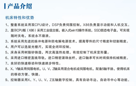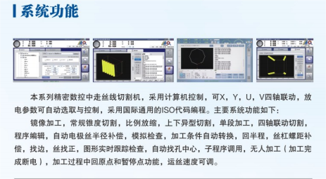 簡介—— 鏡像加工,常規錐度切割,比例縮放,上下異形切(qiē)割,單段加工,四軸聯動切(qiē)割(gē),程序編輯,自動電極絲半徑(jìng)補償,模擬檢查,加工條件